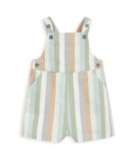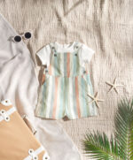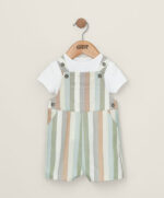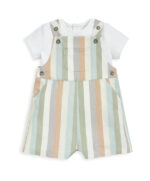 2 részes csíkos kantáros nadrág és body szett: Csíkos rövid kantáros nadrág állítható pántokkal. Oldalzsebekkel és foltzsebekkel elöl és hátul. Rövid ujjú body puha pamut jersey anyagból. Hátul patentos nyílással. Patentos rögzítés az ülepén.