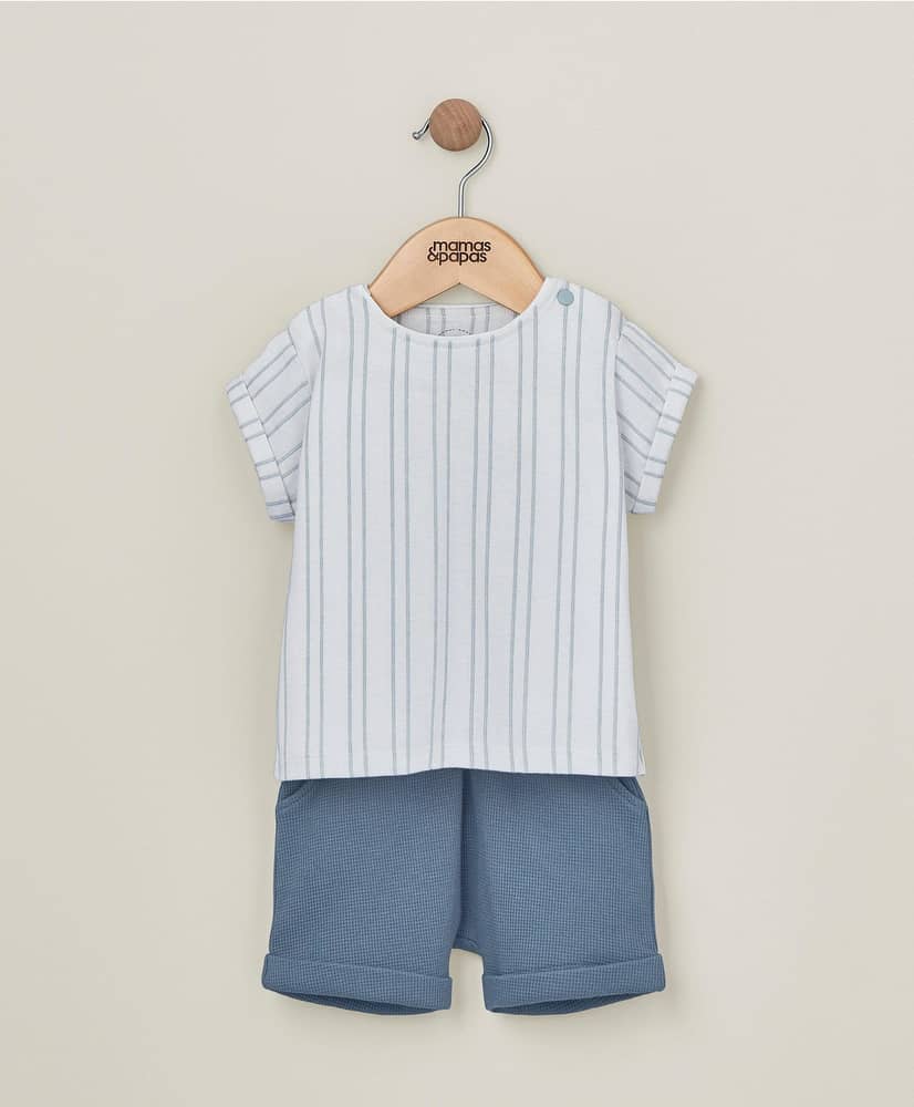 Összeillő póló és rövidnadrág szett: Rövid ujjú póló 100% pamut jersey anyagból, függőleges csíkokkal. Szőtt Hello World kitűző. Patentos vállnyílással az egyszerű öltözködésért. Hozzáillő rövidnadrág jersey waffle anyagból, visszahajtott mandzsettával. Rugalmas derékpánttal a különösen kényelmes illeszkedésért.