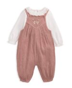 2 darabos szett, kantáros nadrág és body. Body fodros gallérral és mandzsettával. Gyűrött jersey kantáros nadrág virághímzéssel és rejtett gombokkal a pántokon. Patentos rögzítés a lábak között.