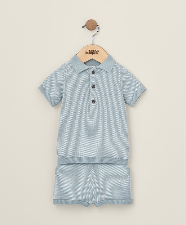 2 részes kötött póló és rövidnadrág szett: Rövid ujjú póló gallérral, 100% pamut kötött jacquard anyagból. Bordázott mandzsettákkal készült. Gombos rögzítéssel. Rövidnadrág 100% pamut kötött anyagból. Funkcionális zsebekkel. Rugalmas derékpánttal.