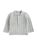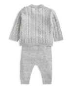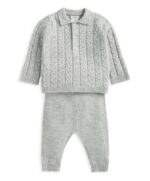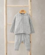 Két részes csavart kötésmintás pulóver és nadrág szett bordázott gallérral és mandzsettákkal. Rugalmas derékpánt a nadrágon.
