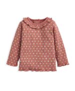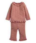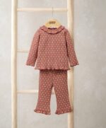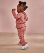 Ez a puha, jersey anyagból készült 2 részes szett tökéletes választás a mindennapokra. A hosszúujjú felsőt virágos mintázat, fodros nyakkivágás, enyhén bővülő ujjvégek és hátul patentos záródás teszi igazán praktikussá. A hozzáillő nadrág rugalmas derékrésszel, foltzsebbel és finom fodros szegélyekkel készült, így kényelmes és csinos megjelenést nyújt egész nap.