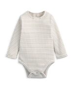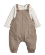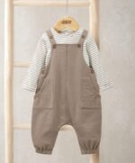 Ez a puha, 2 részes összeállítás kényelmes és praktikus viselet a mindennapokra. A barna kantárosnadrág állítható pántokkal, foltzsebekkel, oldalt gombos és a lábak között patentos kialakítással készült. A hozzáillő, hosszúujjú csíkos body rugalmas anyagból, alsó patentos záródással teszi egyszerűvé az öltöztetést. Ideális szett játékhoz vagy sétához.