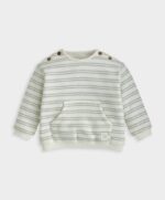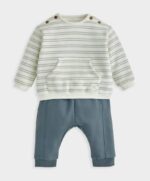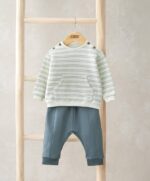 A tökéletes hazatérő kollekció, ez a gyönyörű, időtálló minőségű újszülött kollekció azért készült, hogy gondoskodjon kisbabádról. Gondosan összeválogatott darabok, amelyek tökéletesen illenek egymáshoz, így a mindennapi öltöztetés egyszerű és praktikus. A részletekre fordított figyelem és a jól átgondolt megoldások a szülők számára is könnyen használhatóvá és kezelhetővé teszik ezeket a ruhákat. A Welcome to the World kollekcióban gyengéd anyagok és kényelmes fazonok találkoznak, hogy kisbabád az első heteiben a lehető legkényelmesebben érezze magát. Stílusos csíkos pulcsi és nadrág szett, laza fazonnal, vállon gombnyílással és “HELLO WORLD” jelöléssel. A kényelmes nadrág gumis derékszalaggal és bordázott mandzsettával rendelkezik.