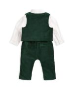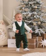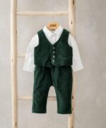 Három részes bársony öltöny szett smaragdzöld színben. Tartalmaz mellényt díszzsebekkel, belső derékméret állítással és hátul rugalmas derékpánttal ellátott nadrágot, övhurkokkal; 100% könnyű pamut inget fordított ujjakkal, foltzsebbel és dísz gombokkal.