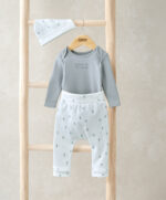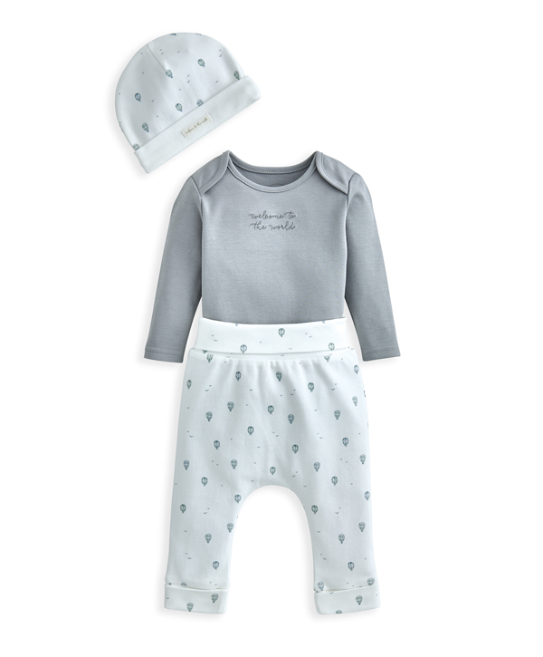Ez a stílusos 3 darabos szett tökéletes választás kényelmes mindennapokra vagy akár ajándékba is. A finom hőlégballonos minta és a puha pamut anyagok ötvözete gondoskodik a kisbabád kényelméről és bájos megjelenéséről.