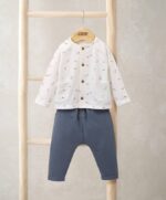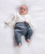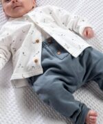 Ez a papírsárkányos mintás, háromrészes szett megkönnyíti a mindennapi öltöztetést. A kabát hosszú raglánujjú, gombos záródású, foltzsebekkel ellátott. A rövidujjú body puha, elasztikus pamutból készült, borítéknyakkal és a lábak között patentos rögzítéssel. A szett hozzáillő nadrága gumis derekú, díszgombokkal és oldalzsebekkel.