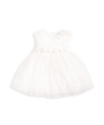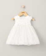 Egy igazán különleges, ünnepi ruha a legkisebbeknek! Ez a gyönyörű fehér, 3D virágdíszítésű ruha rétegzett mesh anyagból készült, hogy elegáns és ünnepi megjelenést biztosítson különleges alkalmakra, mint az Eid vagy családi összejövetelek.