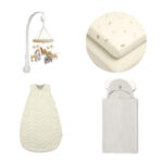 A 4 részes enteriőr csomag tartalma: hálózsák, 2 darab gumis lepedő, zenélő körforgó, kapucnis törölköző.