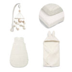 A 4 részes enteriőr csomag tartalma: hálózsák, 2 darab gumis lepedő, zenélő körforgó, kapucnis törölköző.