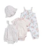 4 darabos rövid ujjú body és hozzáillő sapka csomag: Tartalmaz apró virágos mintás és nagy virágos mintás rugdalózót valamint bordázott bodyt. Patentos rögzítéssel az ülepén. Rendkívül puha, 100% pamutból készült.