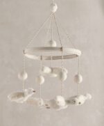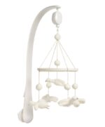 Zenélő körforgó, amelyen 5 imádnivaló plüss kiskacsa lebeg. A kiskacsák rendkívül puha borg anyagból készültek, puha játéktöltettel. Halványfehér és len színek jellemzik. Felhőre emlékeztető pompon részletekkel díszítve.