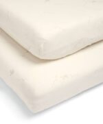Két gumis lepedő egy csomagban, a Mamas & Papas Welcome to the World kollekciójának ikonikus repülő kiskacsás és felhős mintáival. Kézzel festett dizájn lágy bézs színekkel krém alapon. Nagyon puha pamut dzsörzé anyagból. Minden Mamas & Papas kiságy matracra illeszkedik.