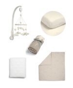 Az 5 részes enteriőr csomag tartalma: paplan, antiallergén steppelt matracvédő huzat, 2 darab gumis lepedő, kötött takaró, zenélő körforgó.