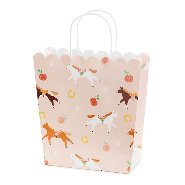 Púderrózsaszín ajándéktasak meseszép lovas mintával, cakkozott szegéllyel. Gyönyörű ajándékcsomagolás egy szülinapi buliba. A tasak mérete 23x22x8.5 cm.