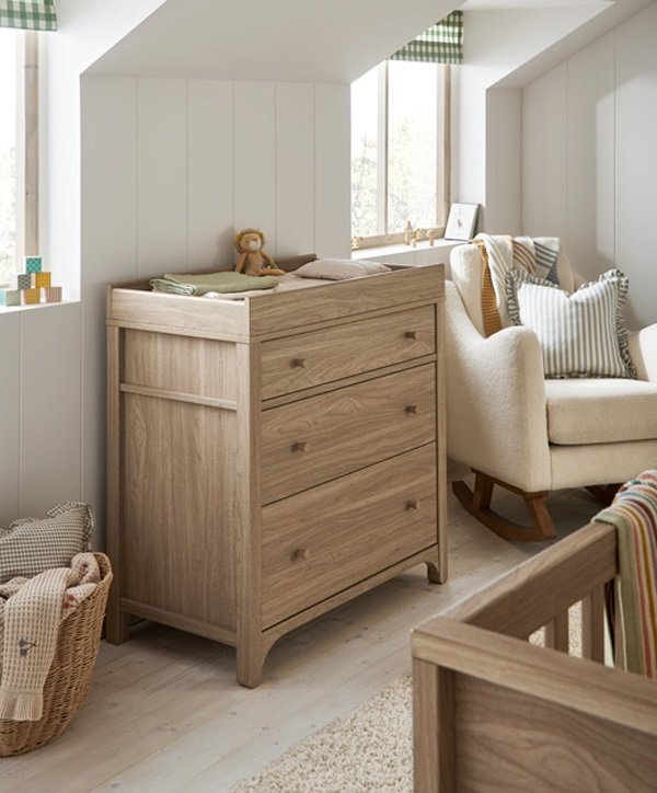 A Barton pelenkázó komód levehető pelenkázórátéttel rendelkezik, így a baba cseperedésével elegáns komóddá alakítható. Finoman záródó fiókjaival és natúr tölgy színével időtálló darabja lesz a babaszobának.