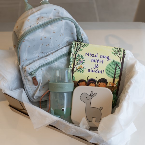 Ötletes Bölcsibe/Oviba készülő ajándékcsomag, ami tartalmaz egy Done by Deer Snack tárolót, egy Done by Deer uzsonnásdobozt, egy Animus könyvet és egy Little Dutch hátizsákot.