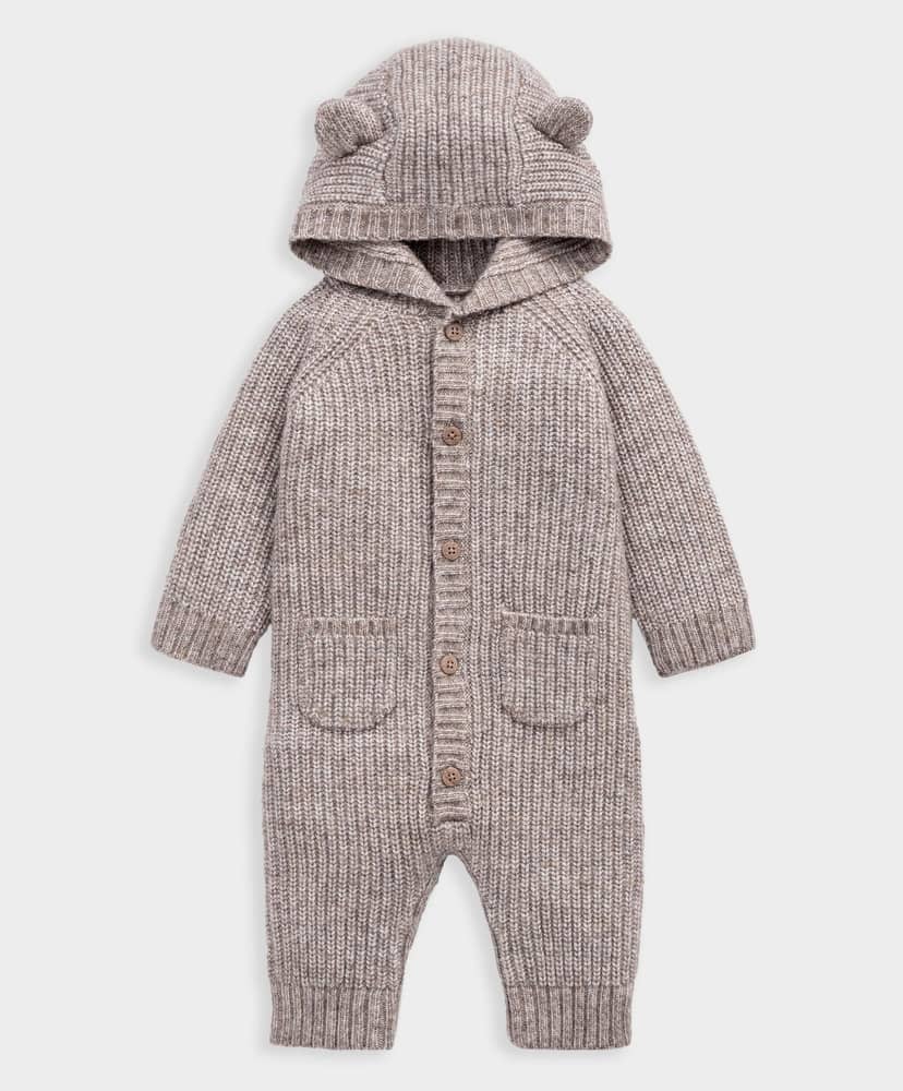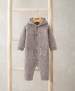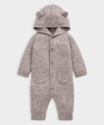 Ez a puha, bordázott kötött rugdalózó tökéletes választás, ha hűvösebb napokon is szeretnéd, hogy a baba melegen és kényelmesen érezze magát. A kapucni aranyos, 3D mackófülekkel díszített, így nemcsak praktikus, de igazán bájos is. A rugdalózón elöl található gombos és a lábak között patentos nyílás megkönnyíti az öltöztetést és a pelenkacserét.