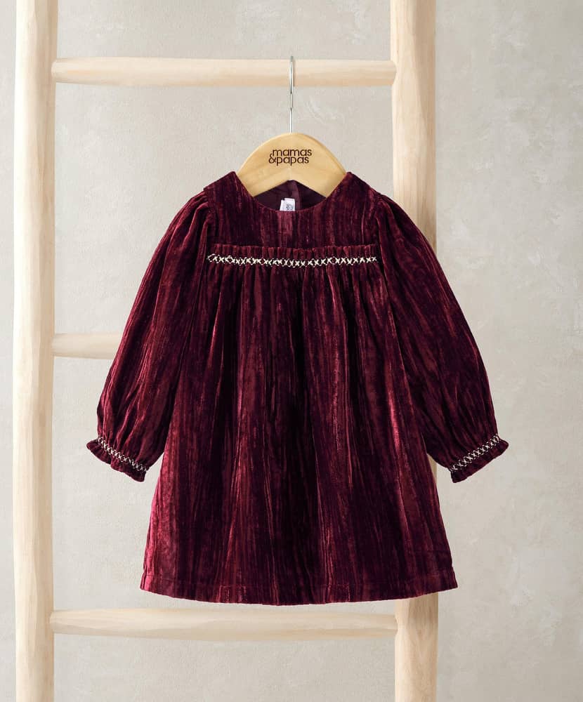 Ha valami igazán különlegeset keresel az ünnepi alkalmakra, ez a bordó bársonyruha tökéletes választás lesz. A puha, gyűrt hatású bársonyból készült darab díszes kézi hímzésű ráncolással, kontrasztos varrásokkal és kényelmes béléses szoknyával garantálja a kényelmet és a stílust egyaránt. A hosszú ujjú kialakítás és a hátoldali gombolás megkönnyíti az öltöztetést.