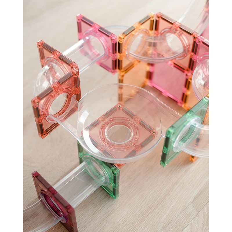Készülj fel a látványos, pörgős és izgalmas játékra a Connetix 80 darabos Pasztell Golyópálya Bővítő csomaggal!