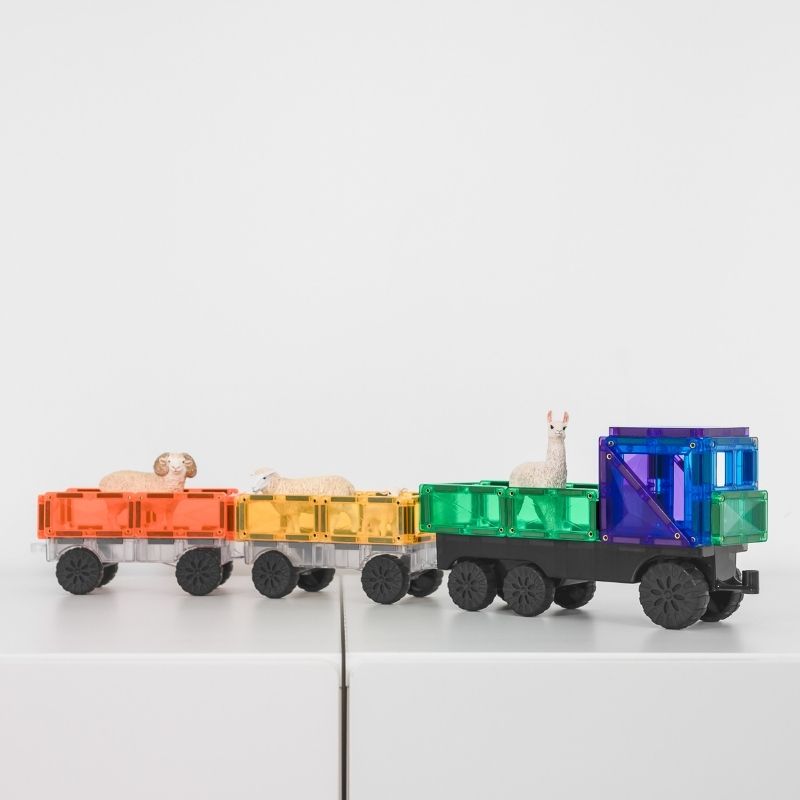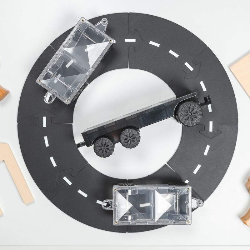 A készlet tartalmazza az ikonikus megfordítható szállító alapot, két átlátszó, gumis kerekű mozgásalapot, valamint számos mágneses elemet, hogy a gyerekek végtelen járműkombinációkat hozhassanak létre.