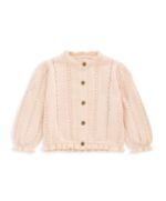 Hosszúujjú kötött horgolt kardigán, cakkozott gallérral. Fodros mandzsetta és szegély. Gombos rögzítés.