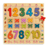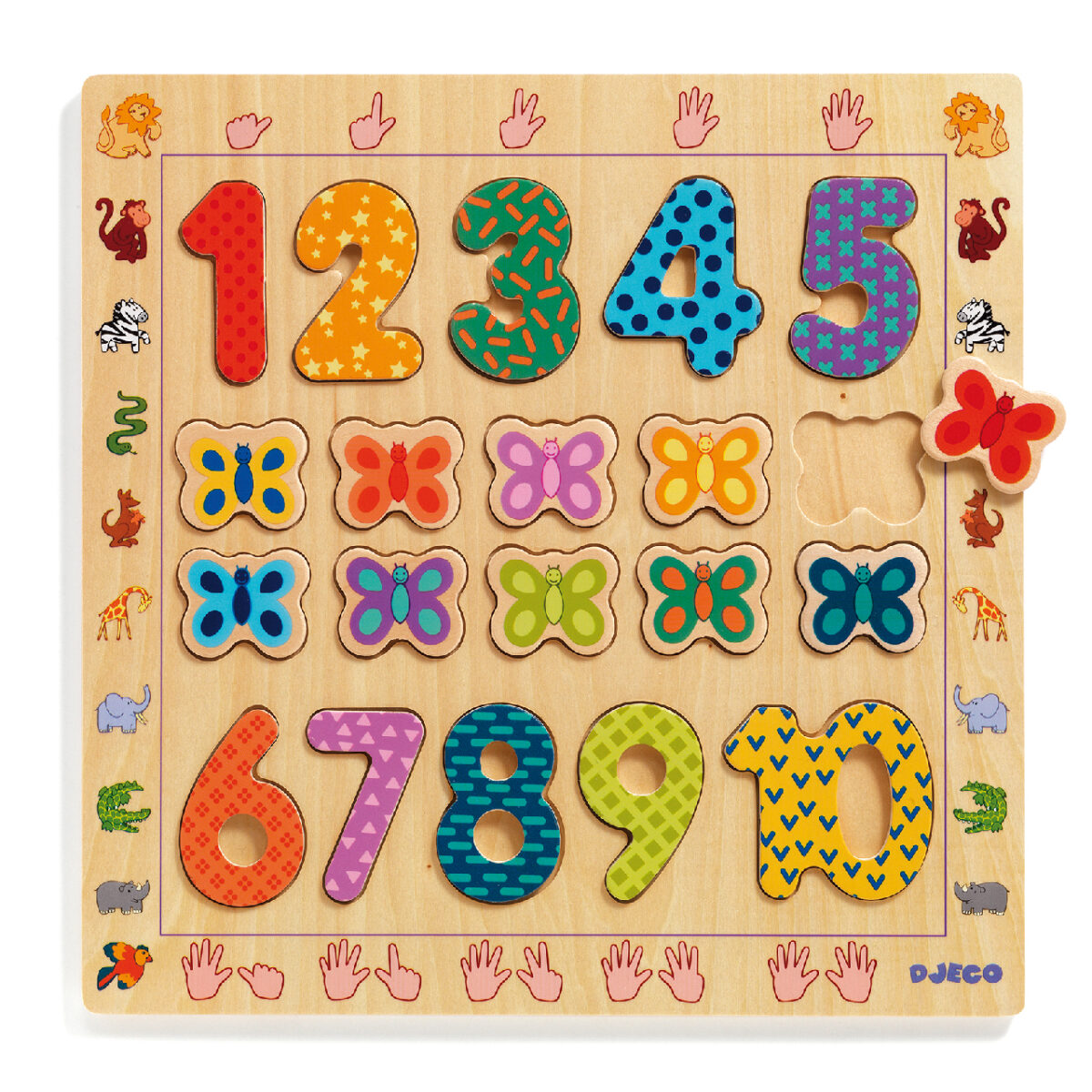 Ez a művészileg kivitelezett fa puzzle elősegíti a tanulást, fejleszti a memóriát, megismerteti a mennyiségek és a számjegyek összefüggését, kapcsolatát. Ez a játék forma-beillesztő puzzle amelynek a visszaillesztő részei a számjegyeket ábrázolja 1-10-ig. Az alaplap miniatűr képei a számlálást segítik, ugyanúgy, mint ahogyan a kivehető, rakosgatható pillangók is. A Djeco fejlesztő játékok tervezőcsapata céltudatosan tervezte oktatójátéknak ezt a képkirakó játékot, amelyet  akár két éves korától  nézegethet, rakosgathat a gyermek, de elkísérheti őt ez a igényes, tartós fa játék az elemi iskola első osztályába is.