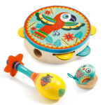 Djeco – Animambo játékhangszer készlet. A hangszerkészlet 3 muzsikus palántának ad a kezébe ritmushangszert. A csörgődob, a kasztanyetta és a rumbatök megfelelő ritmusú, összehangolt megszólaltatása nem is olyan könnyű feladat. Az együttműködés mellett nagyon sok készség fejlődését segíti közvetve, vagy közvetlenül.