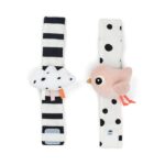 A Happy Clouds témájú Done by Deer Csukló csörgő 2 darab csörgőt tartalmaz: egy madárkásat és egy felhőset. Szenzorosan stimulál, segíti a testtudatot és a kéz felismerését. A kontrasztos pöttyök-csíkok és színes elemek kisbabád látását, a csörgő-zörgő hangok pedig hallását fejlesztik. A pántok tépőzárasak, nemcsak csuklóra, hanem bokára is tehetők.