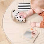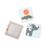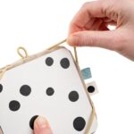 A Done by Deer felakasztható foglalkoztató párna egy puha párna gumis rögzítőpántokkal, melyre 3 szórakoztató elem rögzíthető: 2 fekete-fehér színű kartonpapír kártya, az egyik csíkos, a másik pöttyös és egy babatükör. Az egyes elemek segítik a vizuális felfedezést, fejlődést. A párnára családi képek és más alkotások is rögzíthetők. Többféleképpen is használható: akaszthatod játszószőnyegre, de a földön is megáll, így érdekesebbé teszi a hason töltött időt.