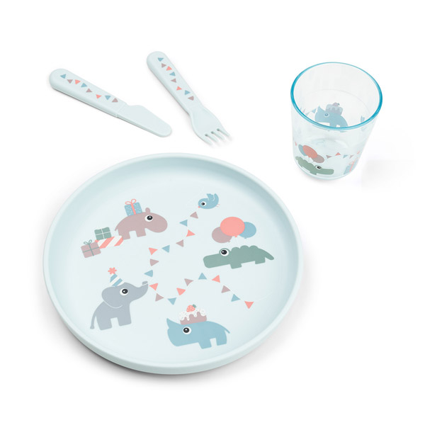 Imádnivaló Done by Deer Foodie étkészlet, Celebration, kék, amely minden étkezést ünneppé varázsol. Tartalmaz tányért, poharat, kést, villát és egy kis könyvet. Biztonságos, BPA- és ftalátmentes választás a kicsik számára.