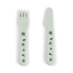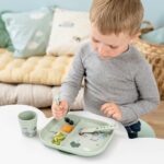 A Done by Deer Foodie étkészlet, Tiny Farm, zöld színű változata tartalmaz egy csúszásmentes többrekeszes tányért, egy mini bögrét és egy evőeszköz szettet. A rekeszes kialakítás és a magas peremek megkönnyítik az étkezést, a lekerekített evőeszközök pedig biztonságos tanulást biztosítanak. A BPA-mentes anyagokból készült szett ideális az önálló étkezés első lépéseihez – praktikus, vidám és megbízható.