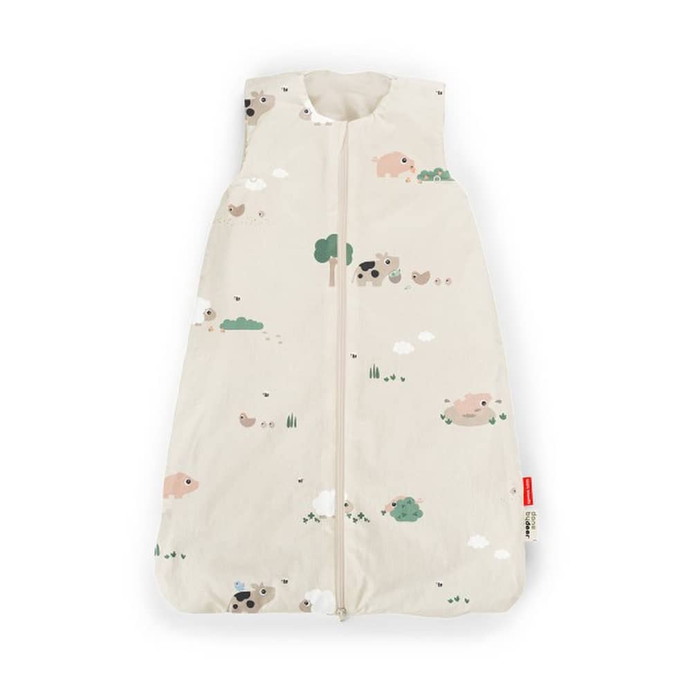 A Done by Deer Hálózsák 70 cm/TOG 2.5, Tiny Farm, homokszínű ideális hidegebb éjszakákra. Puha pamut anyagból és biztonságos cipzárral készült, hogy a baba kényelmesen és melegen aludjon.