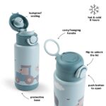 A Done by Deer hőtartó kulacs 340 ml, Tiny Farm, kék tökéletes társ a kisgyermekek kalandjaihoz. Nyomógombos teteje és szivárgásmentes szilikontömítése révén egyszerűen kezelhető, míg a praktikus fogantyú megkönnyíti a szállítást. A kisbarátokkal díszített palack akár 6 órán át megőrzi az ital hőmérsékletét, így tökéletes választás bölcsibe, iskolába vagy kirándulásra.