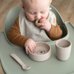 Praktikus, szilikonból készült étkészlet, ami tartalmaz egy bögrét, egy tálat és egy kanalat. Ideális méretű azon kis evők számára, akik éppen most kezdik el az ételek felfedezését. A csúszásmentes, könnyen megragadható szilikon tálka kerekített oldalú, ami megkönnyíti a falatkák felcsipegetését.