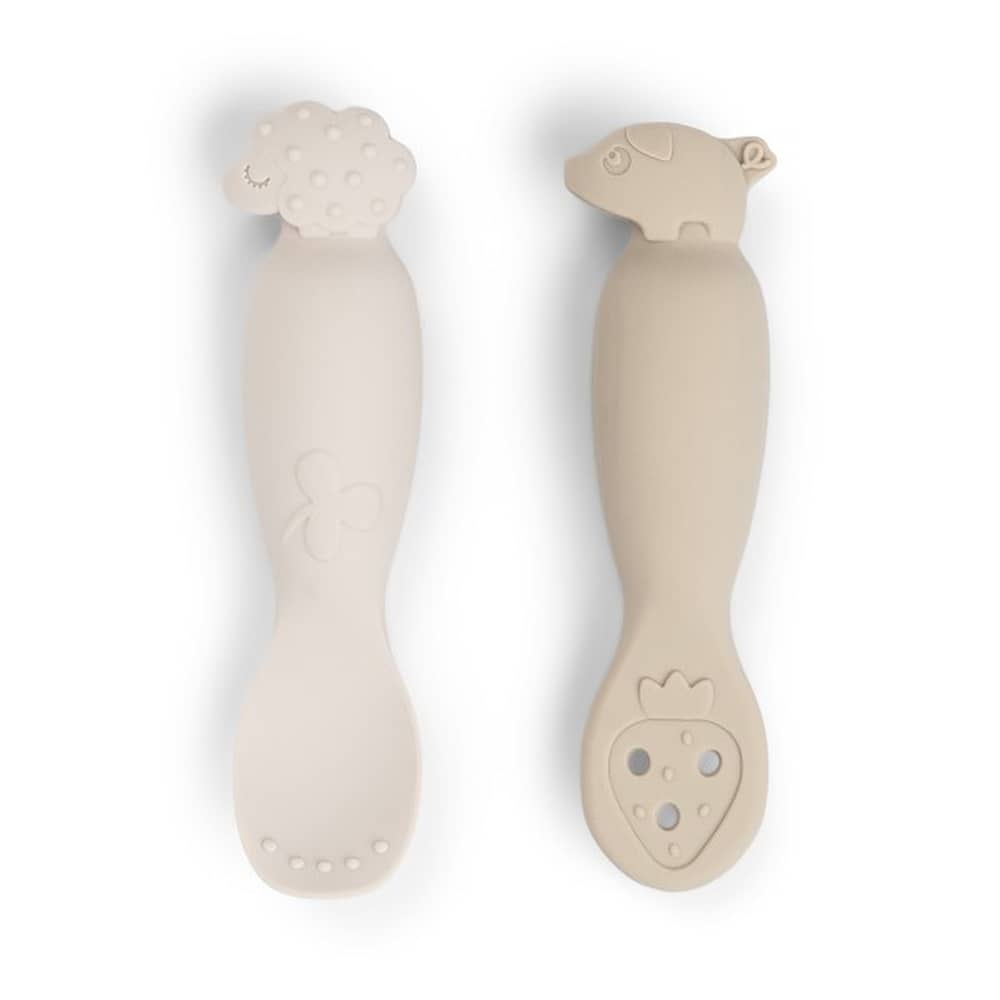 A Done by Deer Tanulókanál szett, Tiny Farm, homokszínű Dotti és Sheepy mintával díszítve, tökéletes társ a kicsik étkezési készségeinek fejlesztésében. Két különböző kanál biztosítja az ételek felfedezését és a helyes fogást. BPA-mentes és tartós anyagól készült, így hosszú élettartamot garantál.