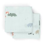 A Done by Deer Textilpelenka, 2 db, Playground, kék színben Croco, Elphee és Nozo mintával készült. Puha muszlin anyaga légáteresztő és kényelmes a baba számára. OEKO-TEX® minősítéssel rendelkezik, mosógépben mosható és tartós.