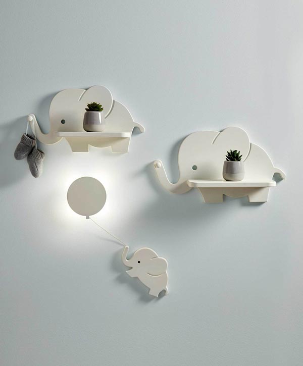 A 2 különböző méretű elefántos polcon kényelmesen tárolhatók gyermeked könyvei, a lufis megnyugtató, lágy éjszakai fény pedig segít a kicsiknek könnyebben álomba merülni.