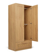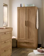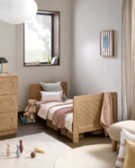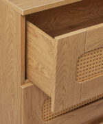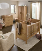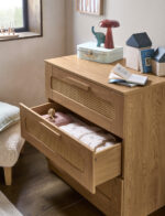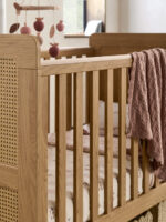 Az Esna szekrény felnőtt méretű belső tere elegendő helyet biztosít a baba ruháinak – most és a későbbiekben is. Az alsó fiók további tárolási lehetőséget kínál, míg a finoman záródó ajtók és fiókok segítenek megőrizni a nyugodt alvási környezetet. A kollekcióra jellemző dizájnelemek – meleg fa tónusok, rattan hatás és ívelt formák – itt is megjelennek, így a szekrény tökéletesen illeszkedik a babaszoba enteriőrjébe.