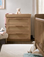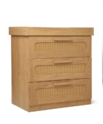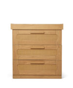 A három mély, finoman záródó fiókkal rendelkező Esna pelenkázó komód nemcsak praktikus, hanem hosszú távon is használható. A levehető pelenkázó feltét eltávolítása után elegáns tárolóbútorként funkcionálhat. Az Esna kollekcióra jellemző dizájnelemek, a meleg faárnyalatok, a rattan hatás és az ívelt részletek ezen a darabon is visszaköszönnek.