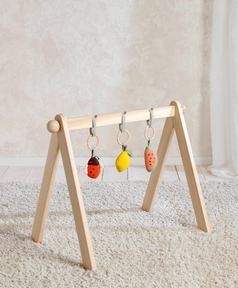 Természetes anyagú játékív levehető érzékelésfejlesztő játékokkal