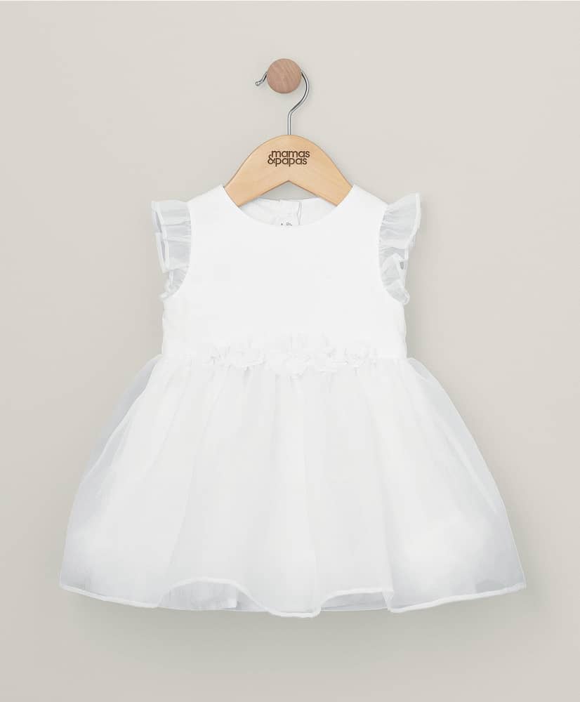 Fehér organza ruha 3D virágokkal: Fehér organza virágos ruha többrétegű szoknyával, organza, lágy háló és pamut bélés rétegekkel, gyűjtött peplummal és fodros szegéllyel. A ruha testrészén hátul három gombos zárással, francia varrással, 3D-s virágdísszel és dupla rétegű organza fodros ujjakkal.