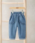 Ez a fodros részletekkel díszített farmernadrág tökéletes társ lesz a mindennapi kalandokhoz – kényelmes, praktikus és stílusos egyszerre. A puha pamutanyag és a rugalmas derékrész gondoskodik a mozgásszabadságról, miközben a fodros zsebek játékos megjelenést kölcsönöznek.