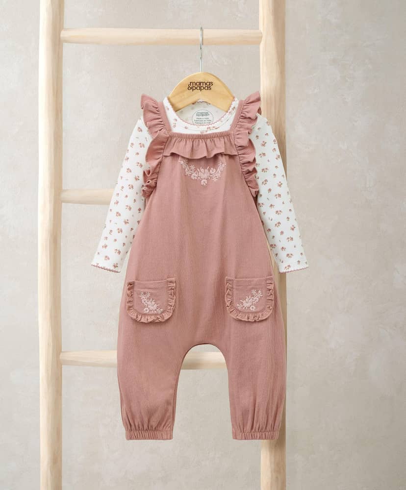 Fodros rózsaszín kantárosnadrág és virágos body szett