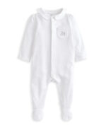 Ez a stílusos, fehér rugdalózó Pán Péter gallérral és picot szegéllyel a szélein tökéletes választás az elegáns, mégis kényelmes viseletre.