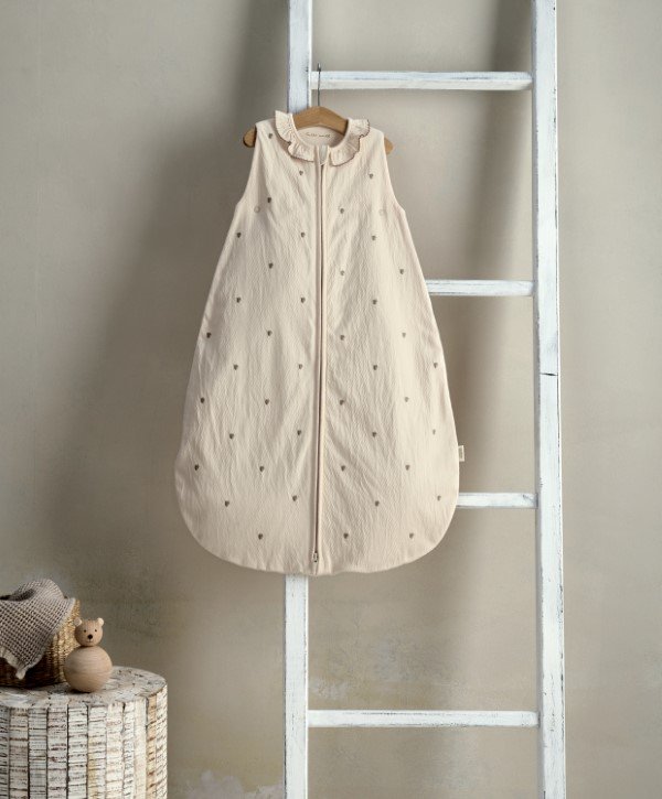 Halványrózsaszín hálózsák 0-6 hónapos korig. Apró epermintával, fodros gallérral, vékonyabb 1.0 Tog-os jersey anyaggal, ami tökéletes a nyári hónapokban.