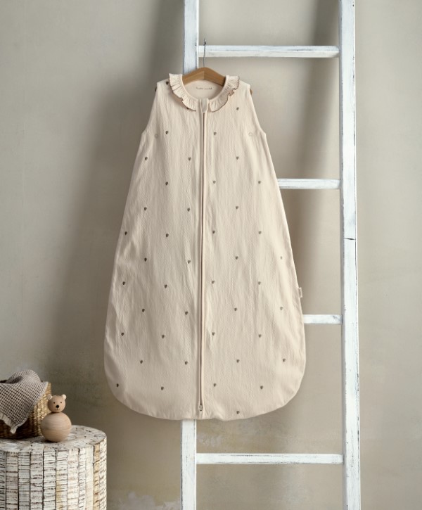 Halványrózsaszín hálózsák 6-18 hónapos korig. Apró epermintával, fodros gallérral, vékonyabb 1.0 Tog-os jersey anyaggal, ami tökéletes a nyári hónapokban.