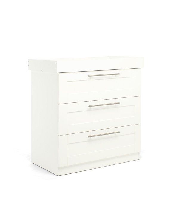 A Hampden pelenkázó komód – Fehér praktikus és stílusos választás a babaszobába. Három mély fiókjának és levehető pelenkázórátétjének köszönhetően hosszú távon is ideális bútordarab, amely segít rendszerezni a mindennapi teendőket. Letisztult formája és puha cashmere színe bármilyen enteriőrbe beilleszthető.