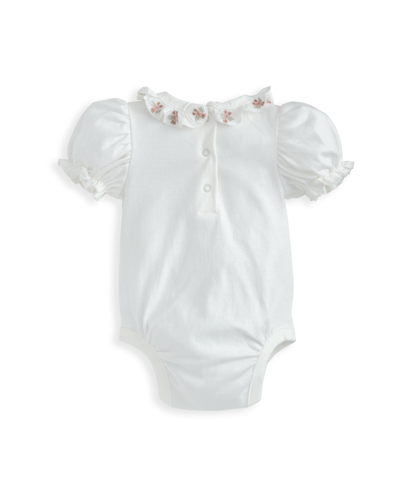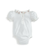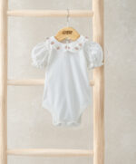 Ez a bájos body igazi különlegesség a kisbabák ruhatárában. A finoman hímzett fodros Pán Péter gallér és a puffos rövid ujjak romantikus megjelenést kölcsönöznek, miközben a kialakítás maximálisan kényelmes marad a mindennapi viseléshez.
