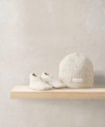 Ez a puha, semleges színű waffle mintás sapka és kiscipő szett tökéletes választás az első hazahozatalhoz vagy ajándékba. A kényelmes, kötött anyag melegen tartja a babát, míg a finom szövött címke apró, stílusos részletként díszíti a szettet. Bájos és praktikus választás minden újszülött számára.